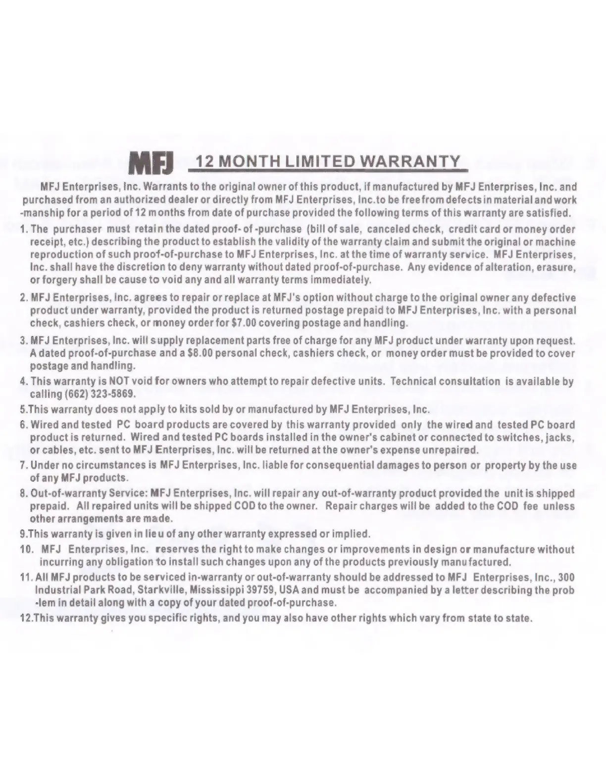 MFJ MFJ-891 - MFJ Limited Warranty; Warranty Coverage; Proof of Purchase; Return for Service