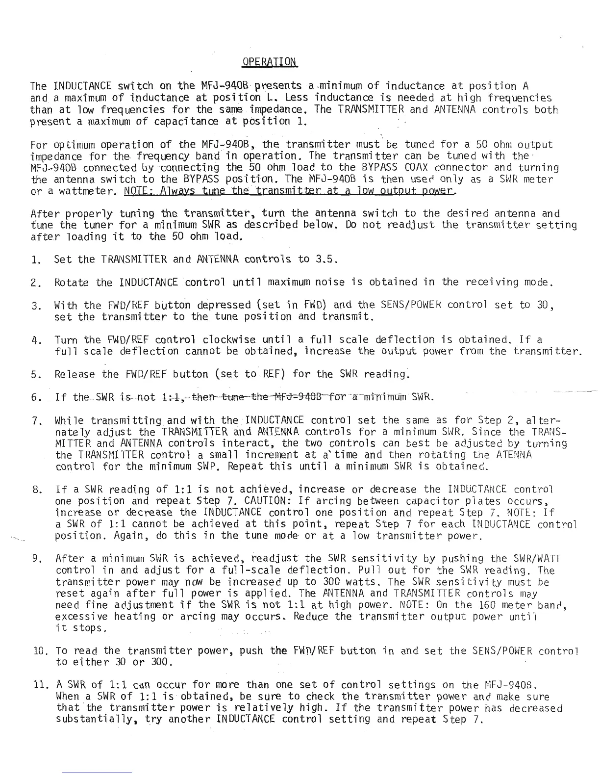 MFJ MFJ-940B - Operation; Tuning Procedure; Final Adjustments and Power