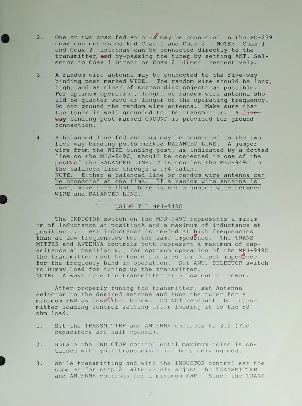 MFJ MFJ-949C - Connecting Coax Antennas; Connecting Random Wire Antenna; Connecting Balanced Line Antenna; Using the MFJ-949 C Tuner