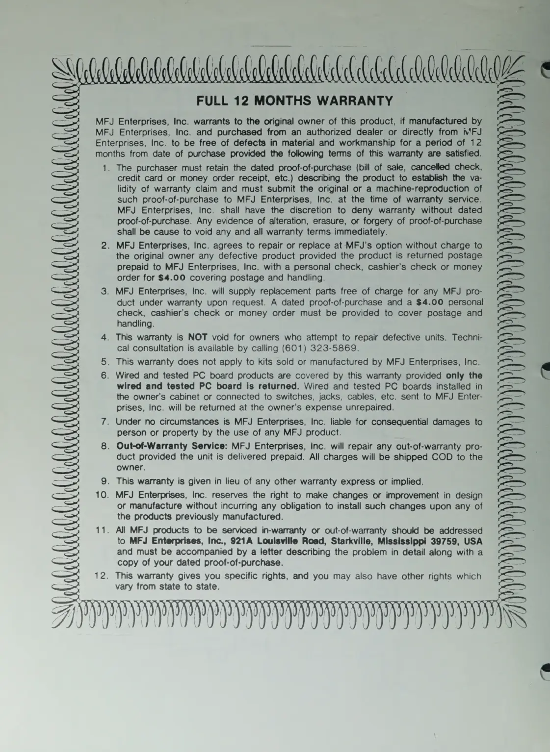 MFJ MFJ-949C - Full 12 Months Warranty Terms