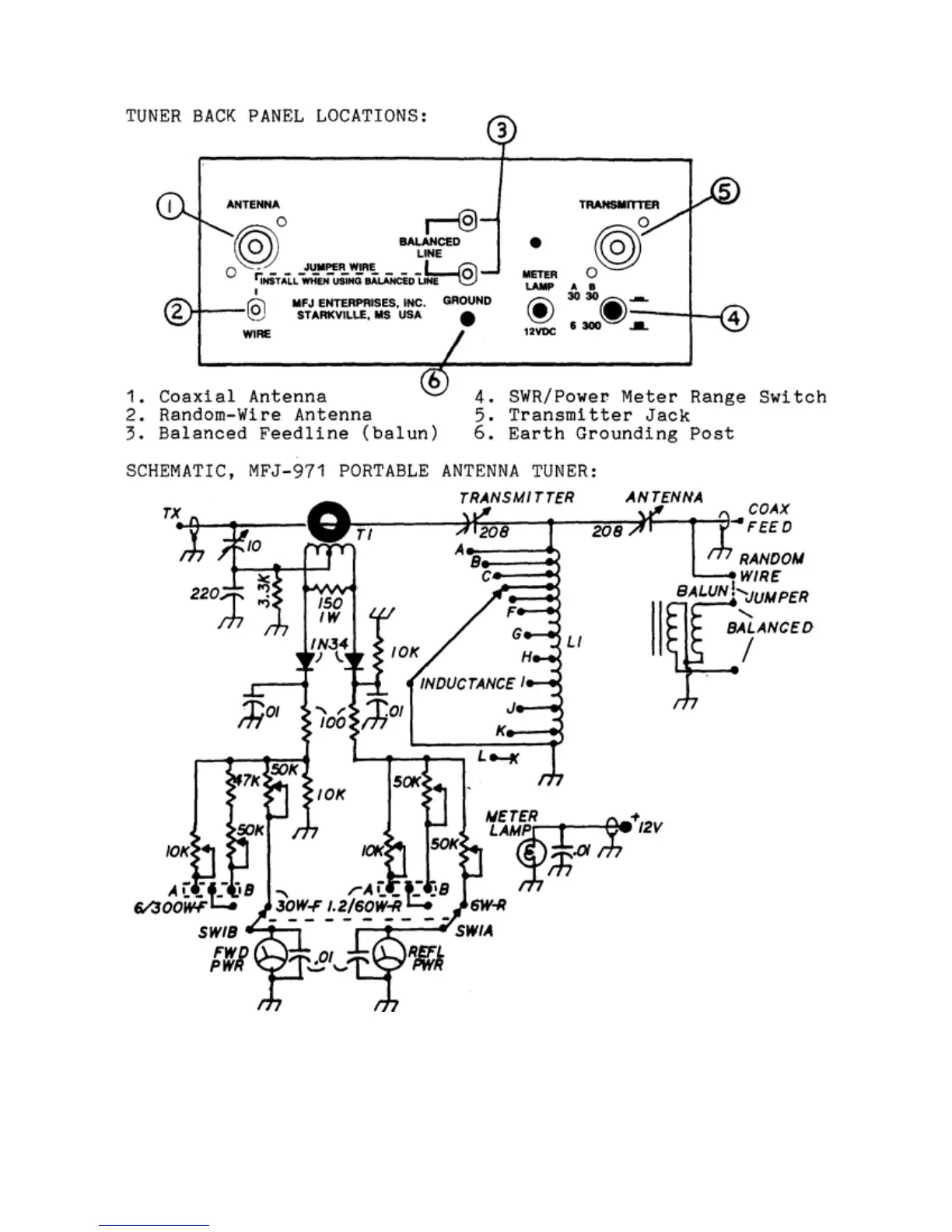 MFJ MFJ-971 - Technical Diagrams and Safety; Tuner Back Panel Locations; MFJ-971 Schematic; Antenna Safety Warning
