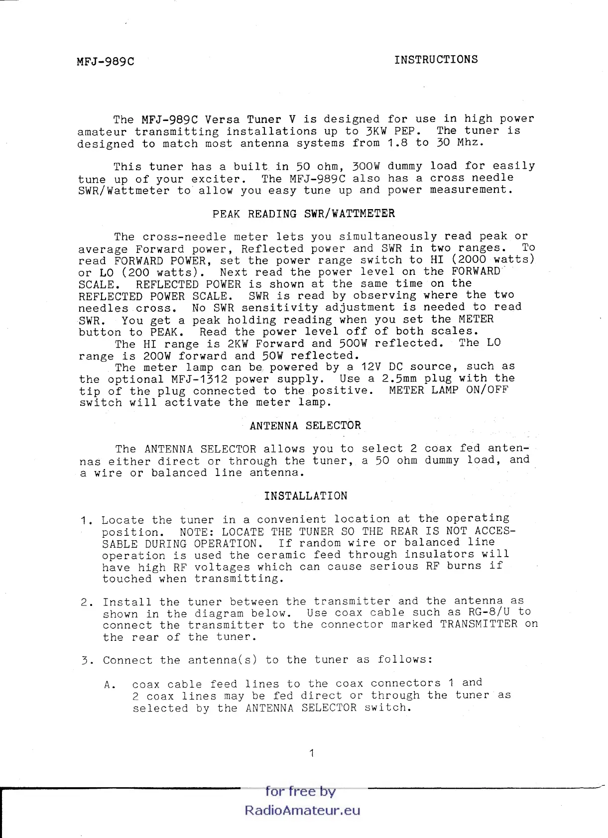 MFJ MFJ-989C - Product Overview and Features; MFJ Versa Tuner V Description; Peak Reading SWR;Wattmeter; Antenna Selector