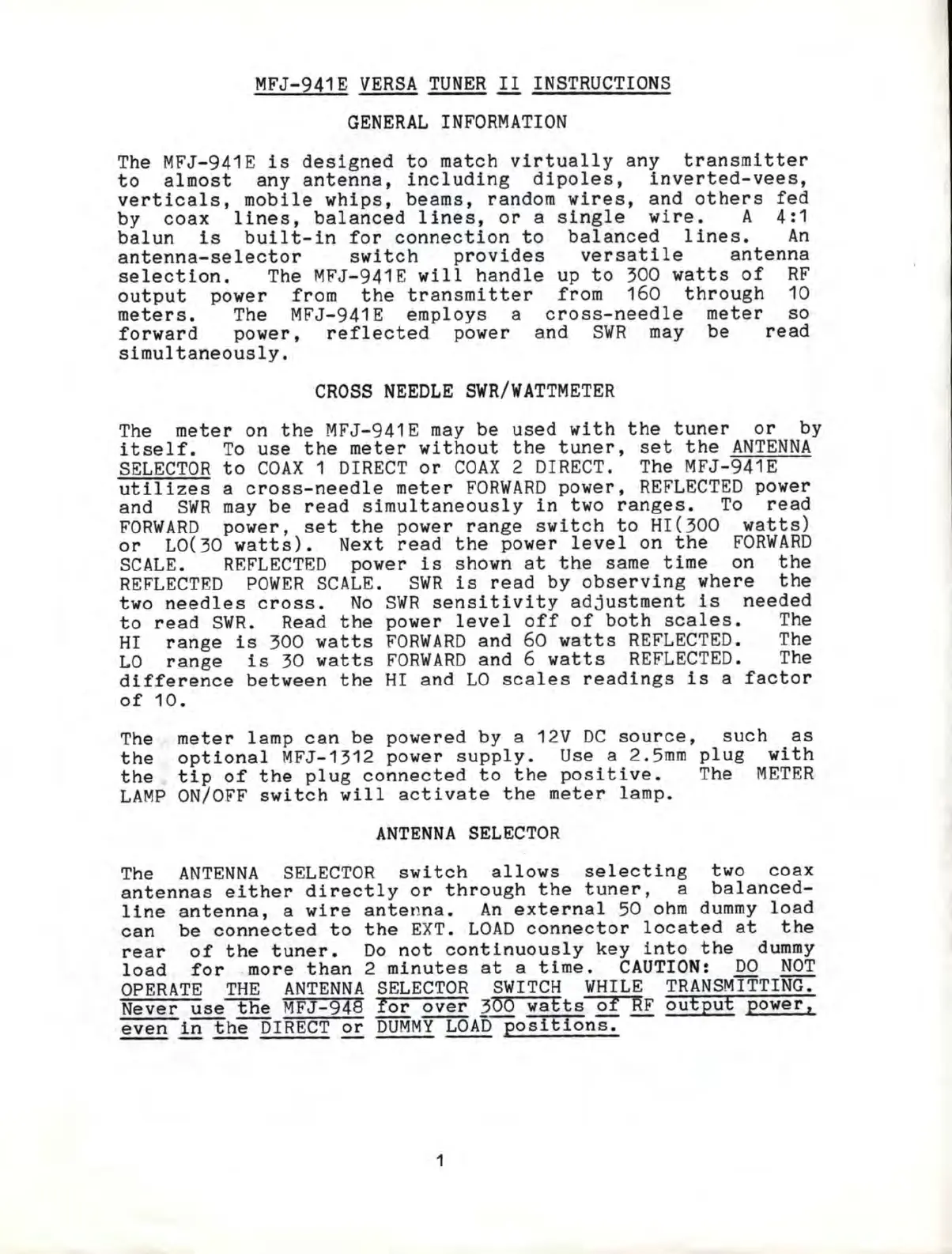 MFJ VERSA TUNER II - General Information and Features; Cross Needle SWR;Wattmeter; Antenna Selector