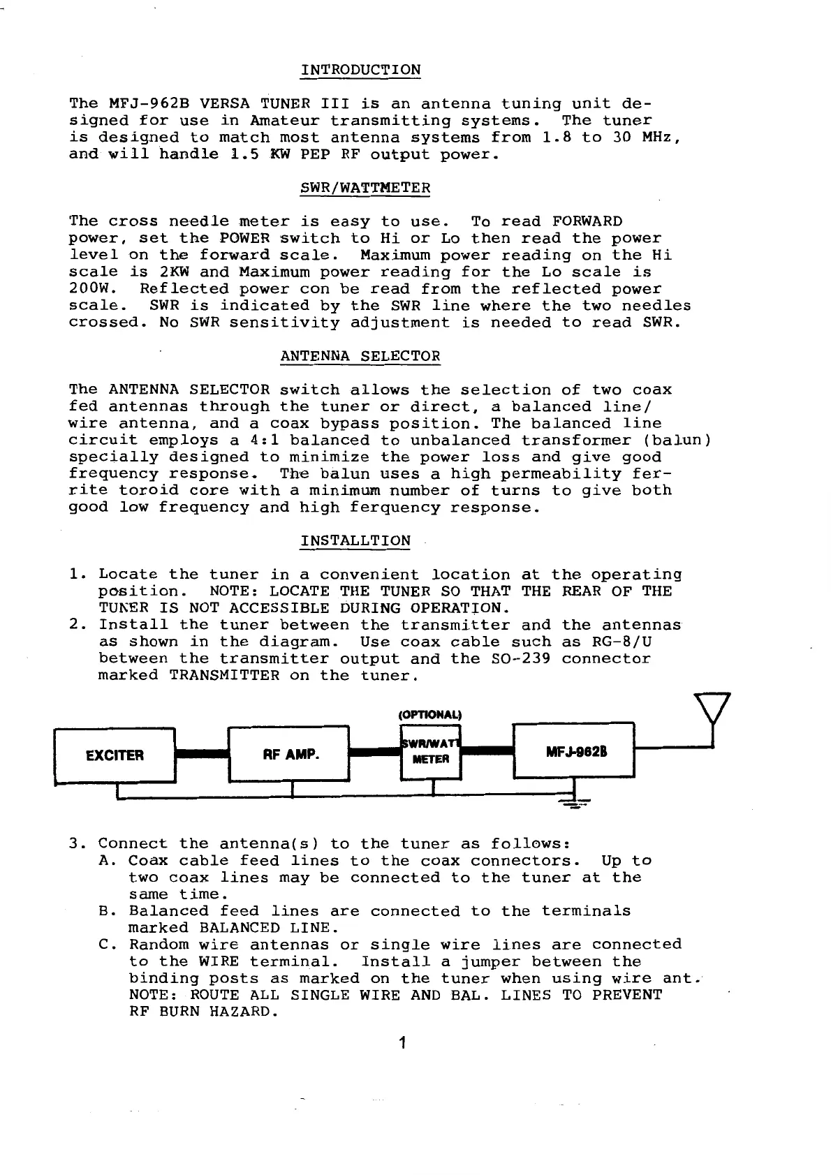 MFJ VERSA TUNER III - Introduction to MFJ-962 B Versa Tuner III; SWR;Wattmeter Functionality; Antenna Selector Operation; Installation Guide