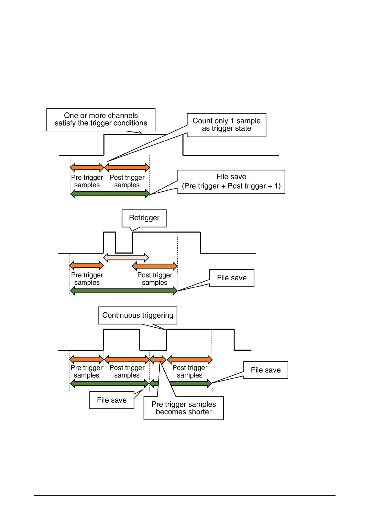 saved in the file should be set in [Pre trigger samples] and [Post trigger samples]. The data sample interval