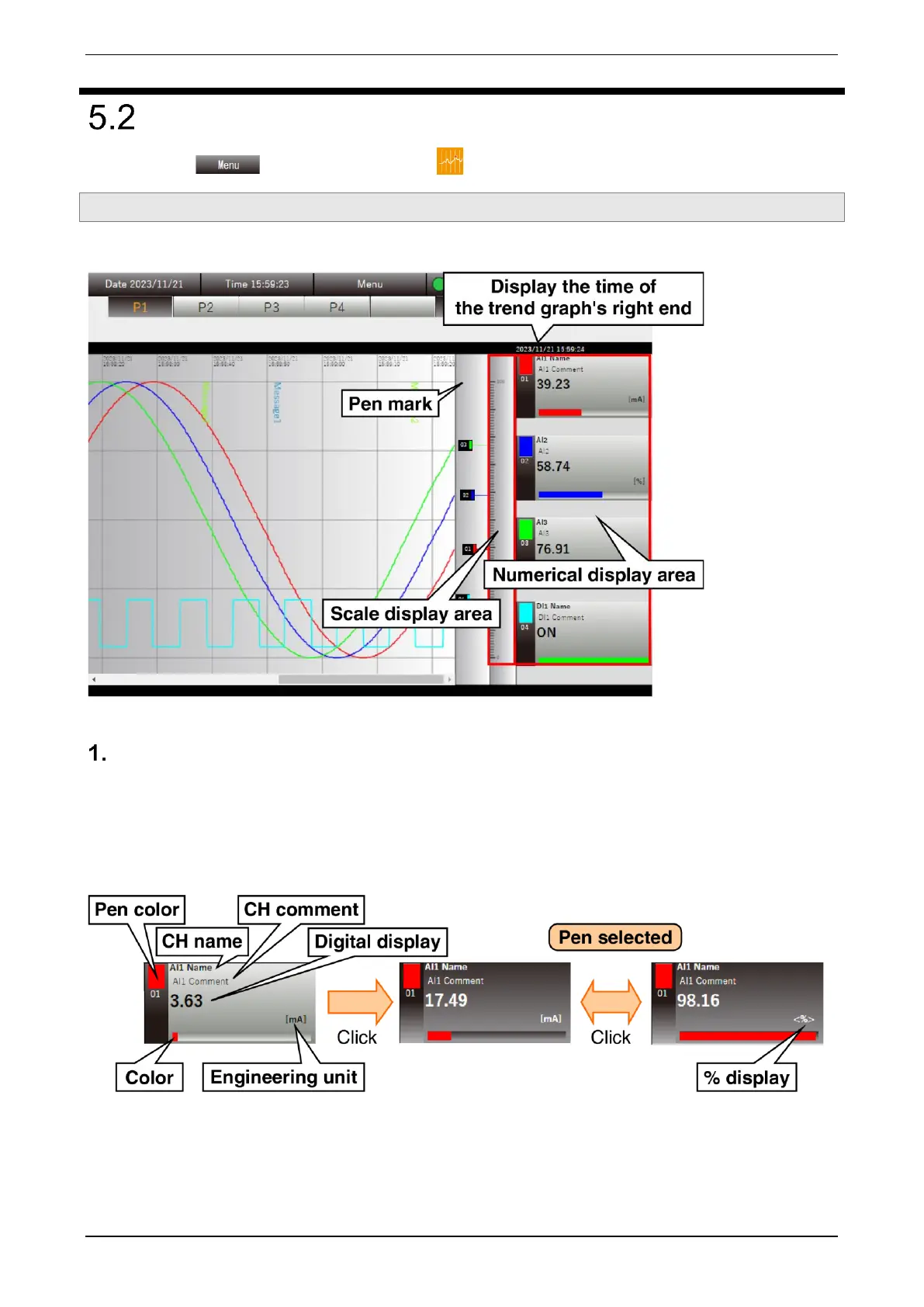 The “Trend” display largely consists of the “Menu bar,” “Page switching button,” and “Trend area.”