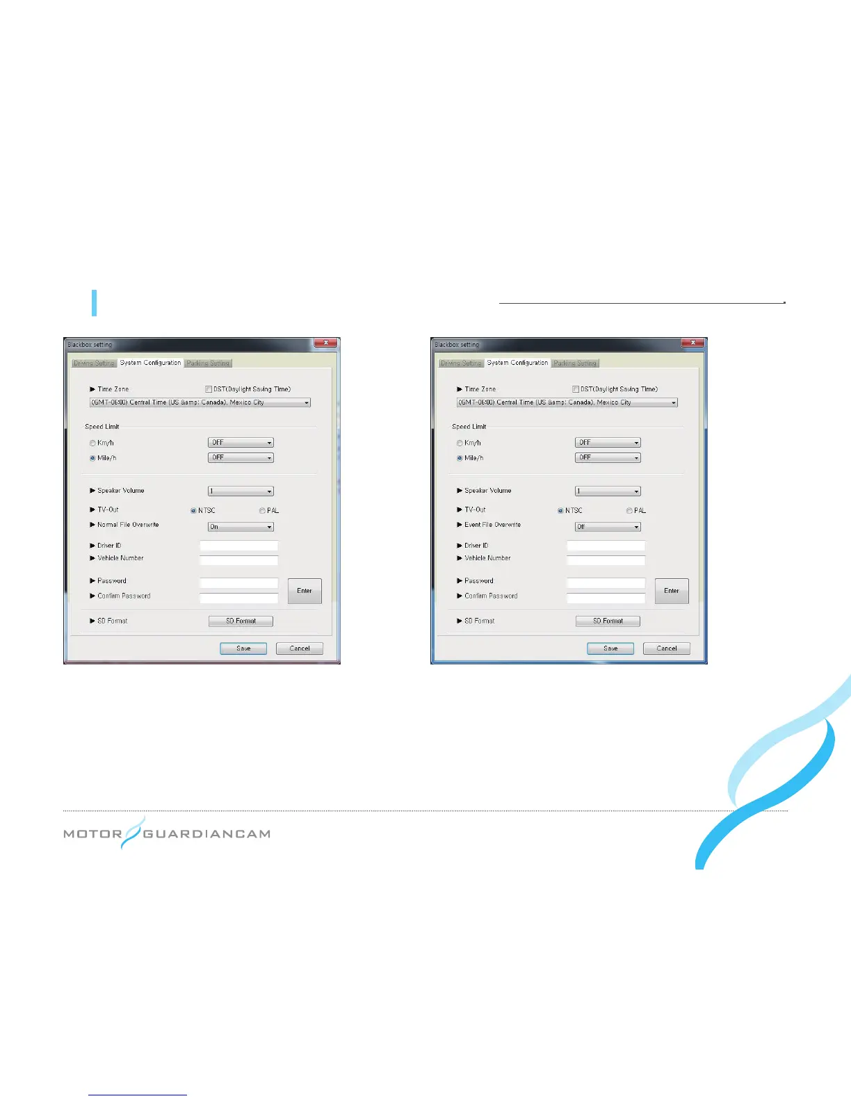This menu is intended to decide the Time Zone, Speed Limit, Speaker Volume, TV-out format, Overwrite, driver