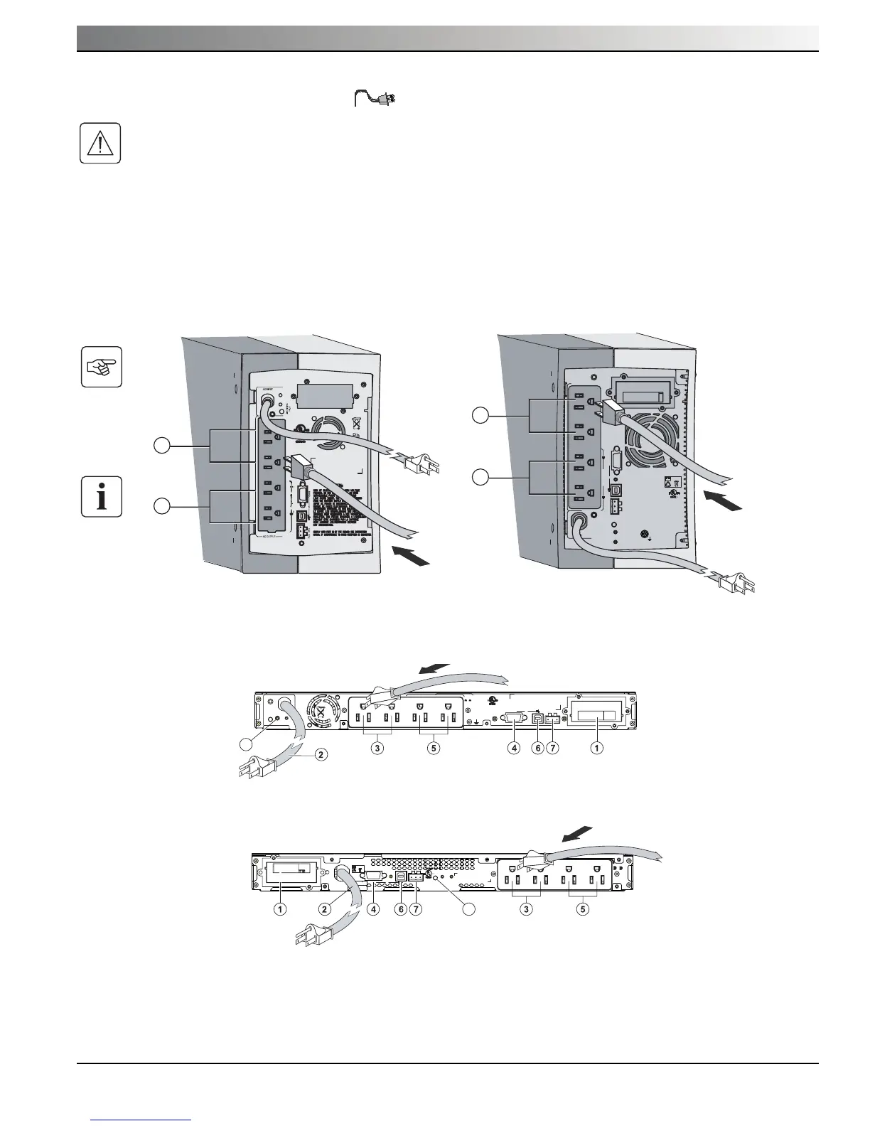 2. Connect the loads to the UPS outlets as shown. It is preferable to connect the priority loads to the two outlets marked