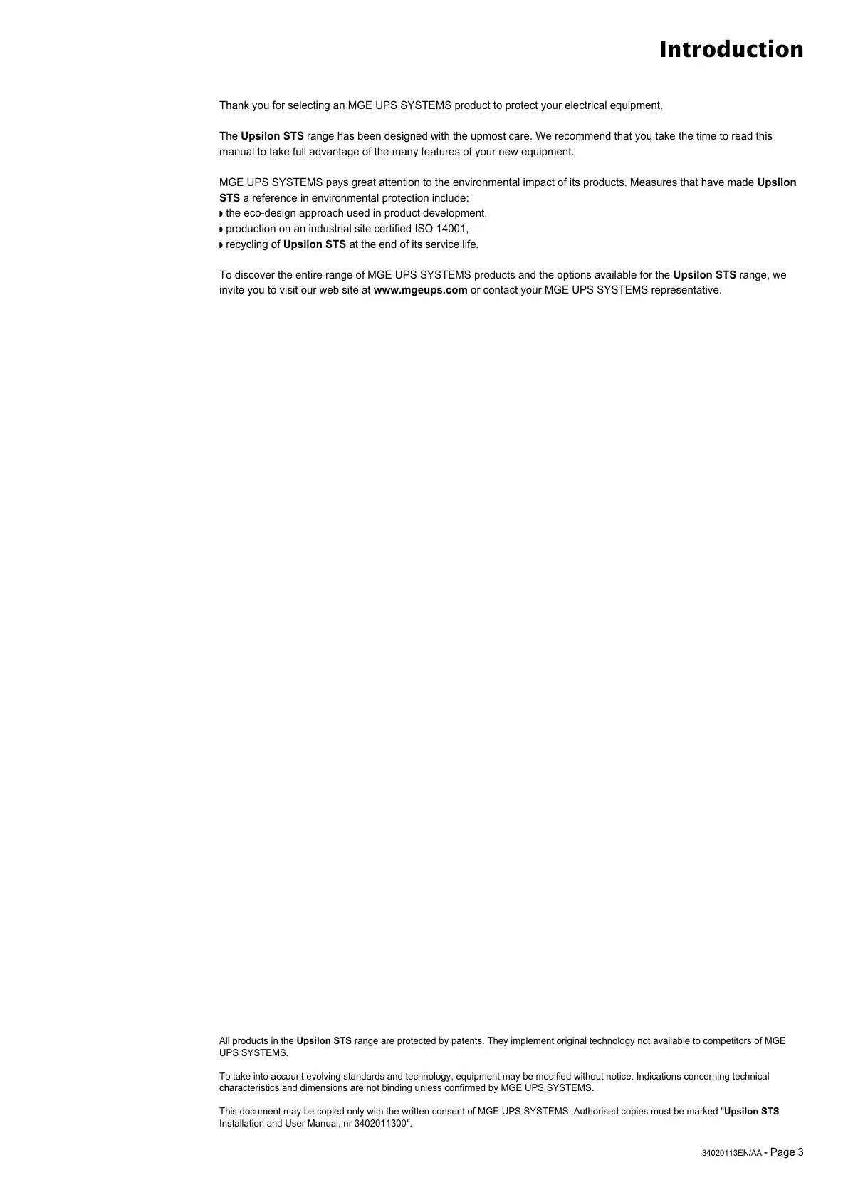 This document may be copied only with the written consent of MGE UPS SYSTEMS. Authorised copies must be marked "Upsilon STS