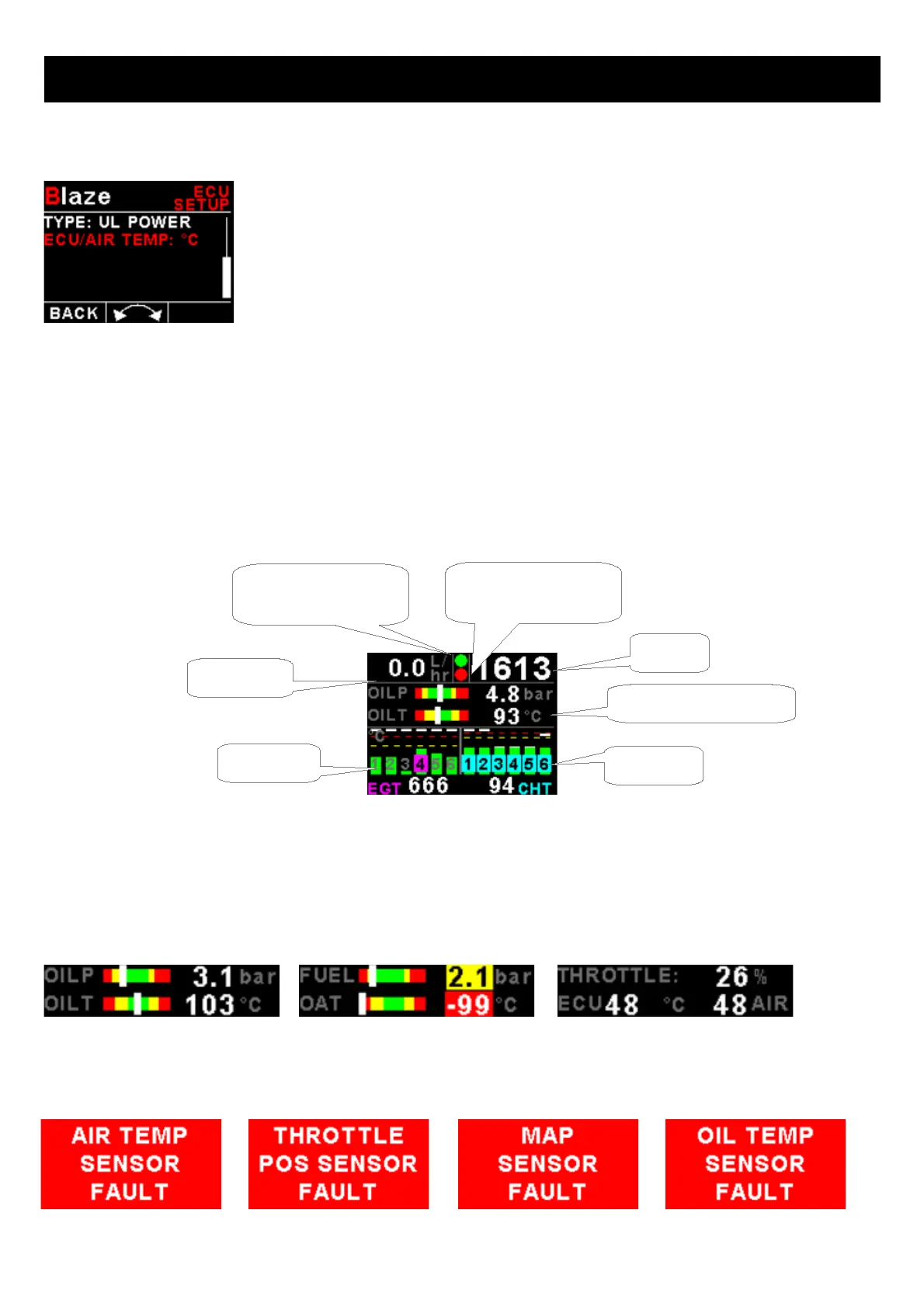 Oil pressure, Oil Temperature, Fuel Pressure, OAT, Throttle position, ECU temperature, air temperature, Volts and