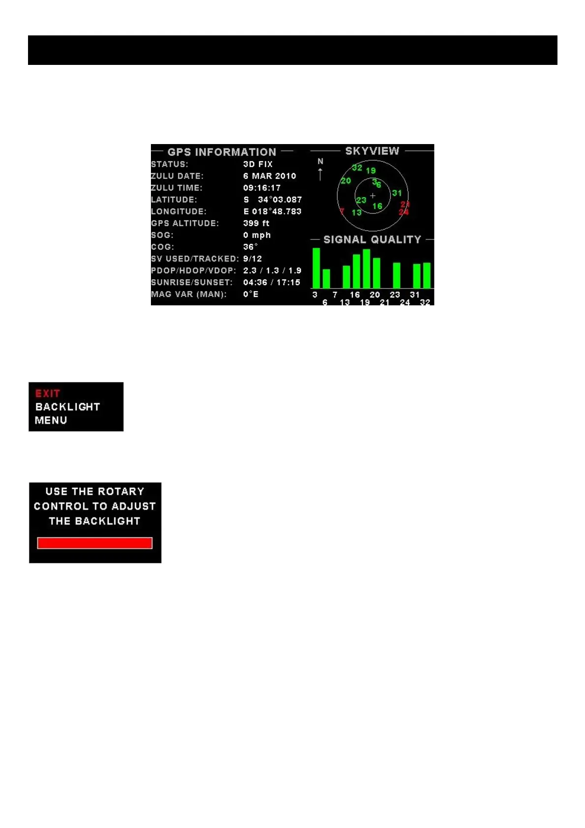 The GPS page show the GPS information in an easy to read format. Sunrise/sunset times as well as the magnetic