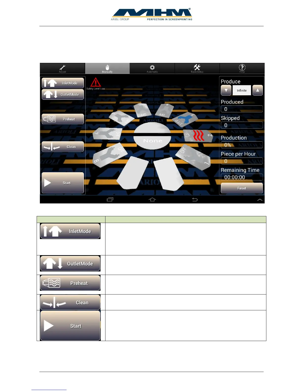 At manual-mode with button “Start” one index and working cycle will be processed.