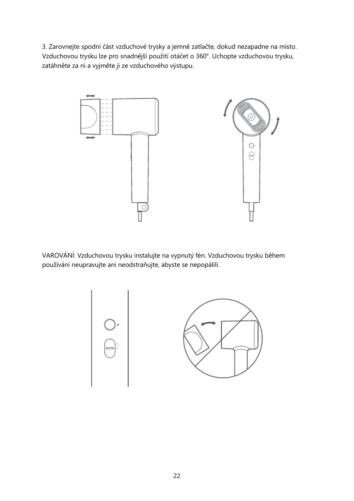 VAROVÁNÍ: Vzduchovou trysku instalujte na vypnutý fén. Vzduchovou trysku během