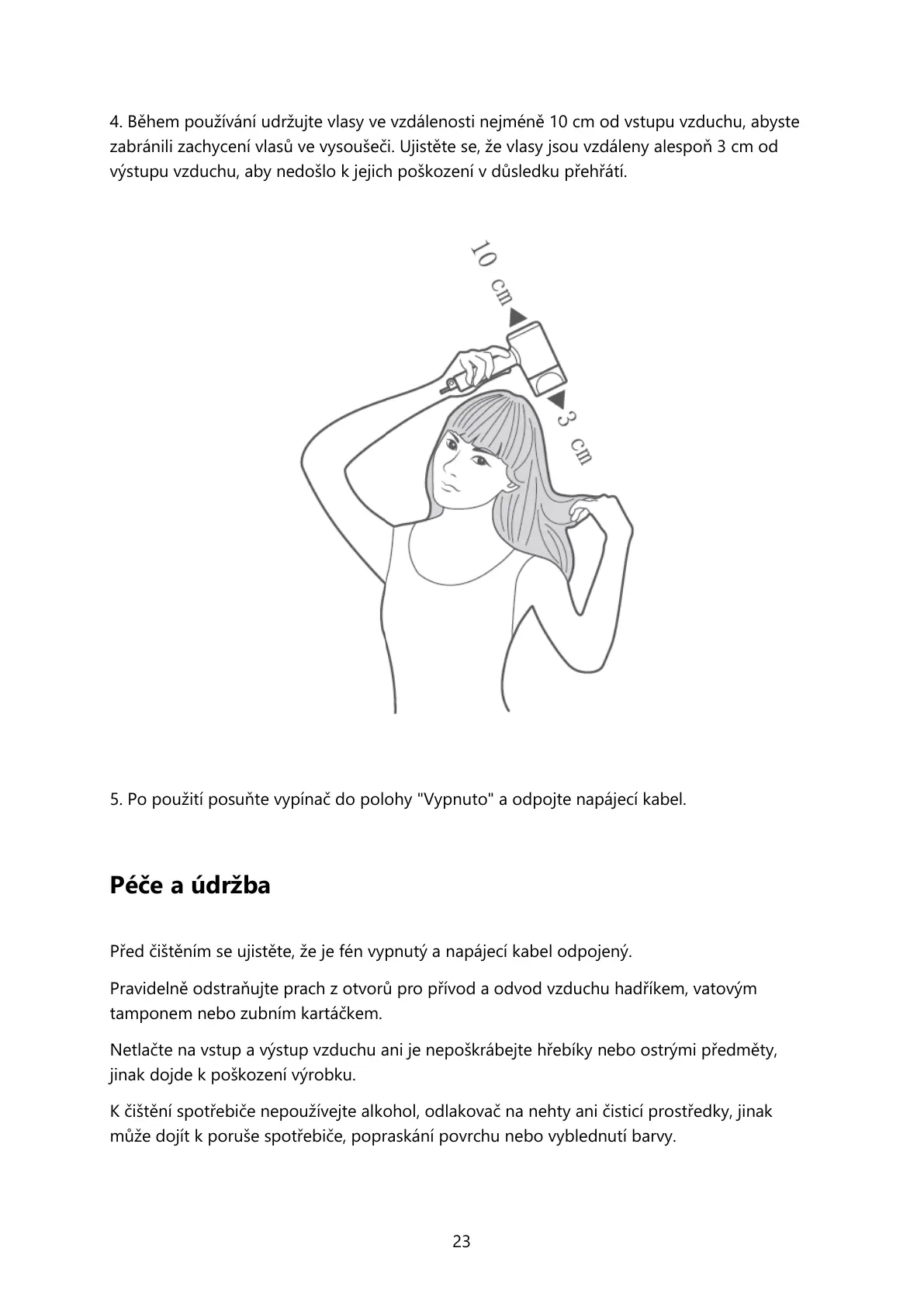 4. Během používání udržujte vlasy ve vzdálenosti nejméně 10 cm od vstupu vzduchu, abyste