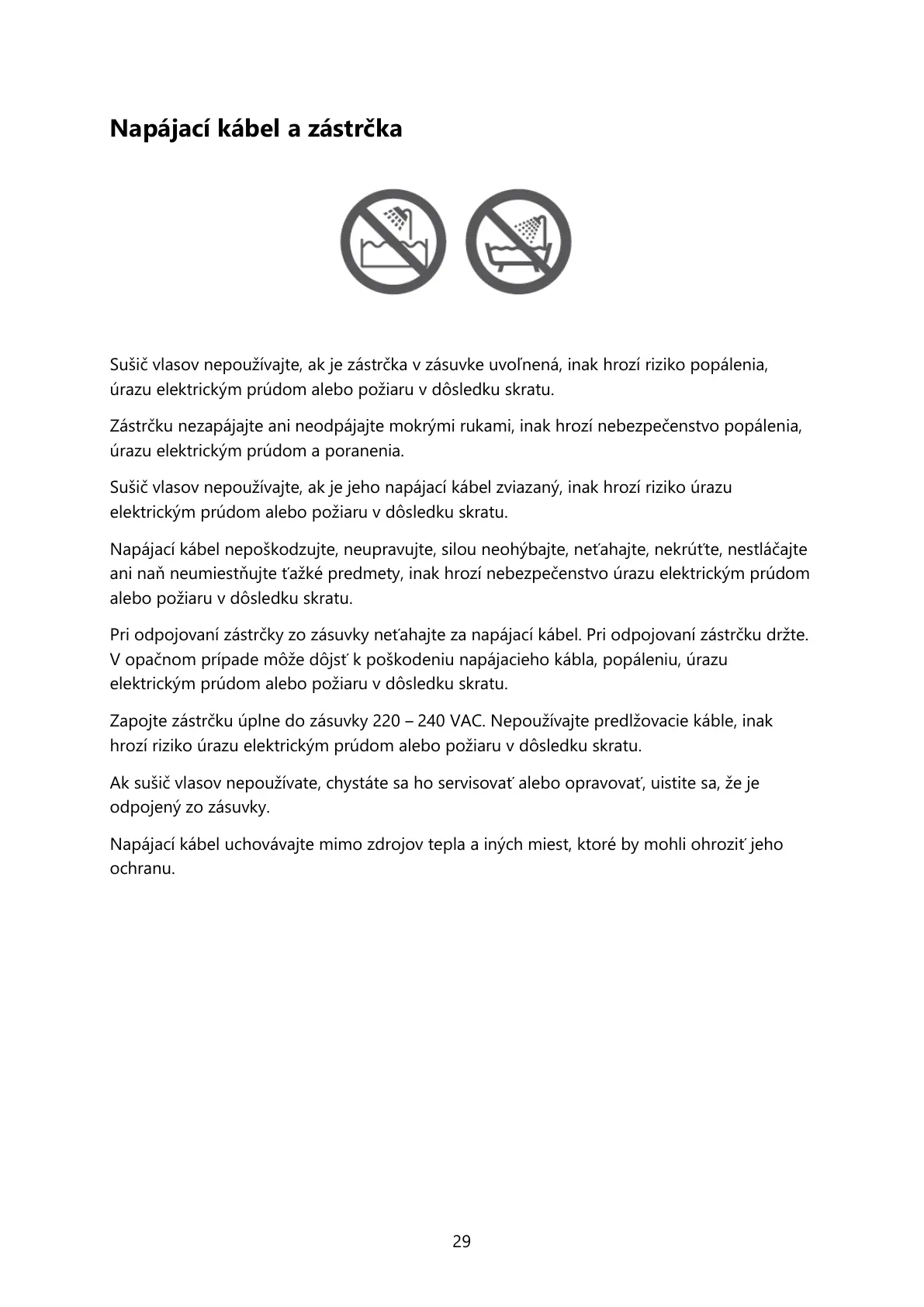 Sušič vlasov nepoužívajte, ak je zástrčka v zásuvke uvoľnená, inak hrozí riziko popálenia,