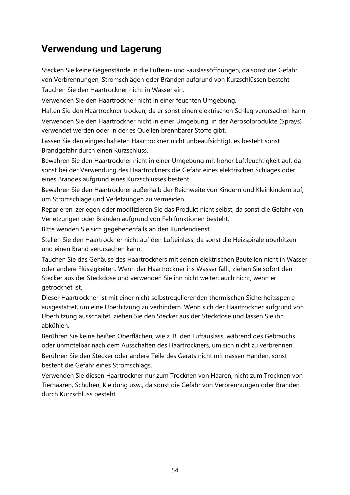 sonst bei der Verwendung des Haartrockners die Gefahr eines elektrischen Schlages oder