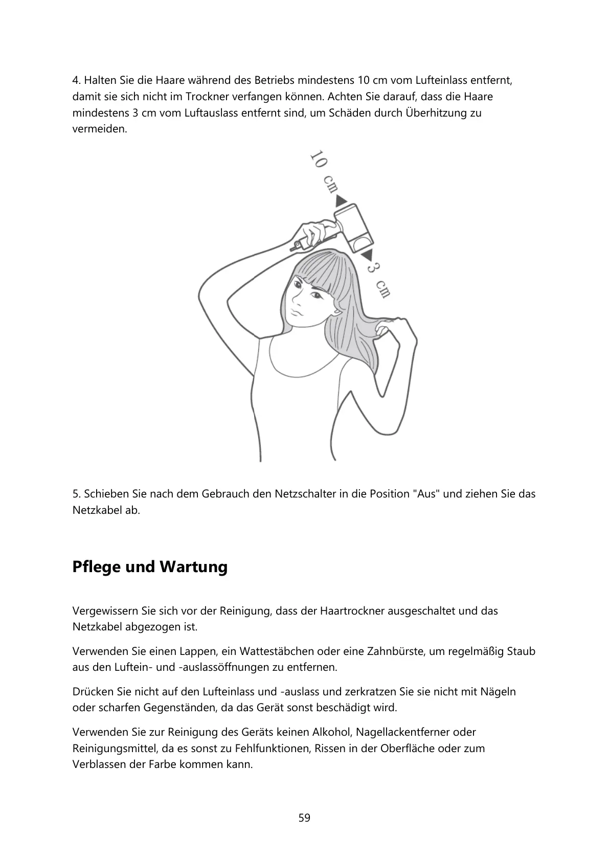4. Halten Sie die Haare während des Betriebs mindestens 10 cm vom Lufteinlass entfernt,