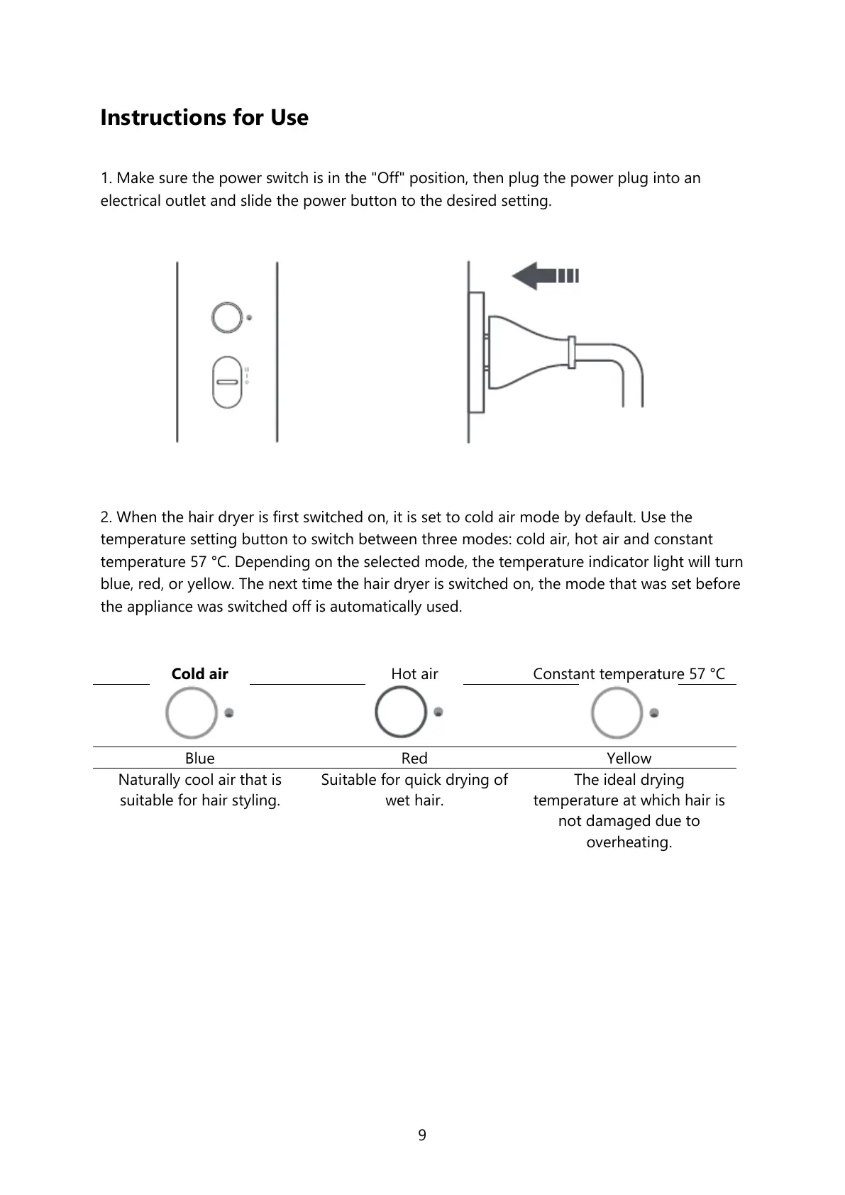 2. When the hair dryer is first switched on, it is set to cold air mode by default. Use the