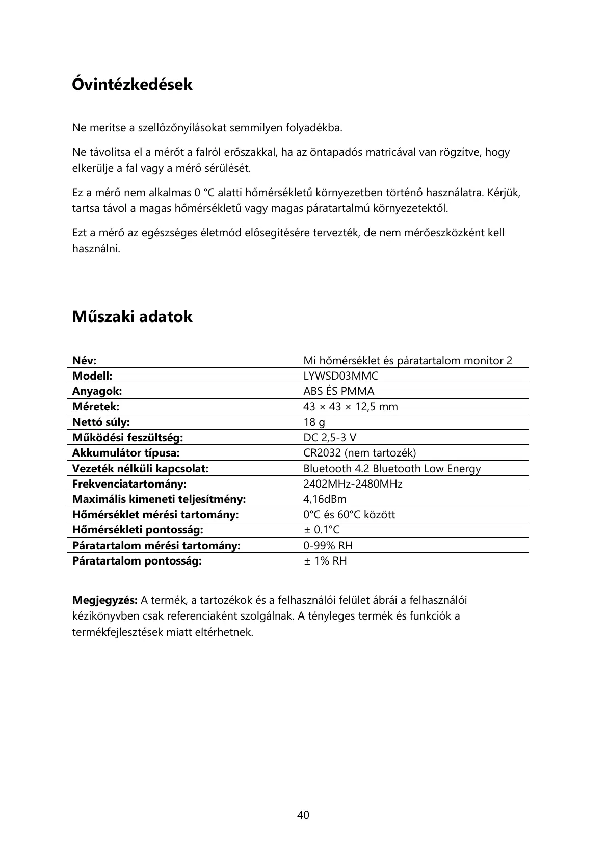 Ez a mérő nem alkalmas 0 °C alatti hőmérsékletű környezetben történő használatra. Kérjük,