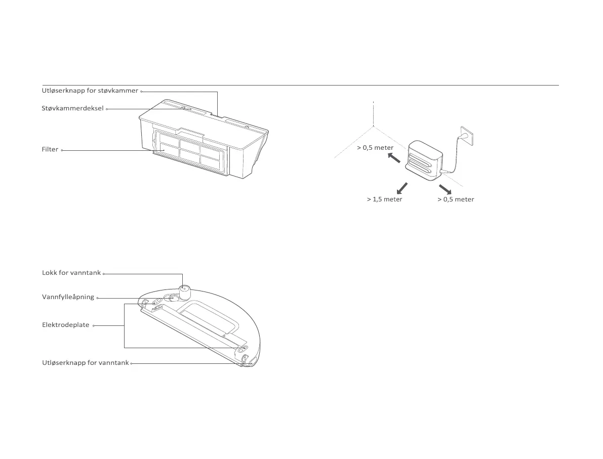 Merk: Støvkammeret må være installert for å starte støvsugermodus og støvsuger- og