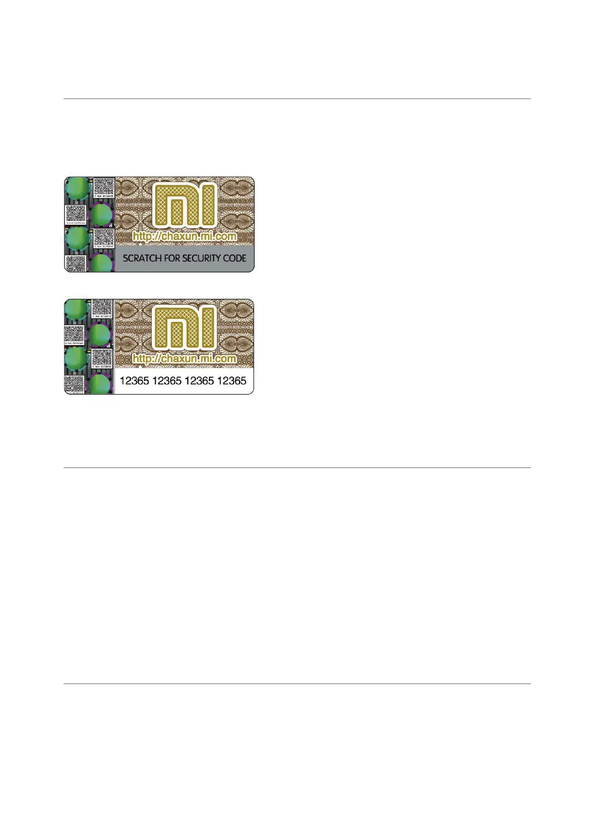 Scratch the anti-counterfeit coating and enter the security code on chaxun.mi.com,