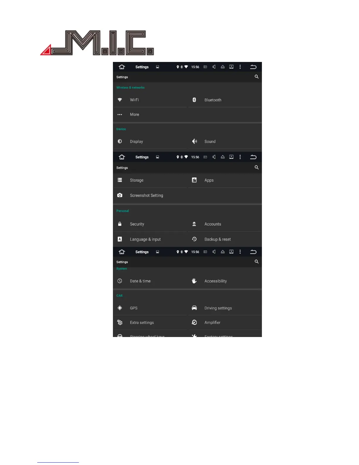 Mic AV8 - System Settings Overview; Wireless & Network Settings; Device and Personal Settings; System and Car Settings