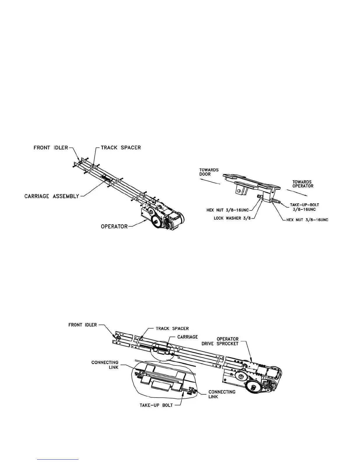 track spacers, around drive sprocket and connect to take-up-bolt using connecting link provided. Adjust take-up-