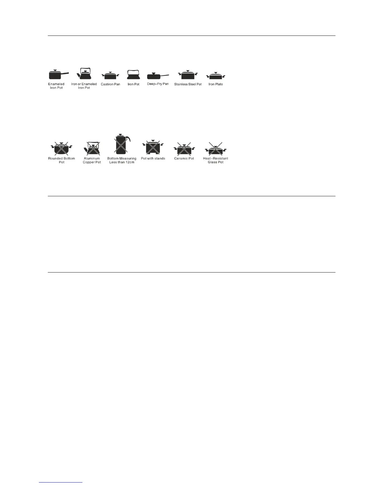 Steel or cast iron, enamelled iron, stainless steel, flat-bottom pans/pots with diameter from 12 to 26 cm.