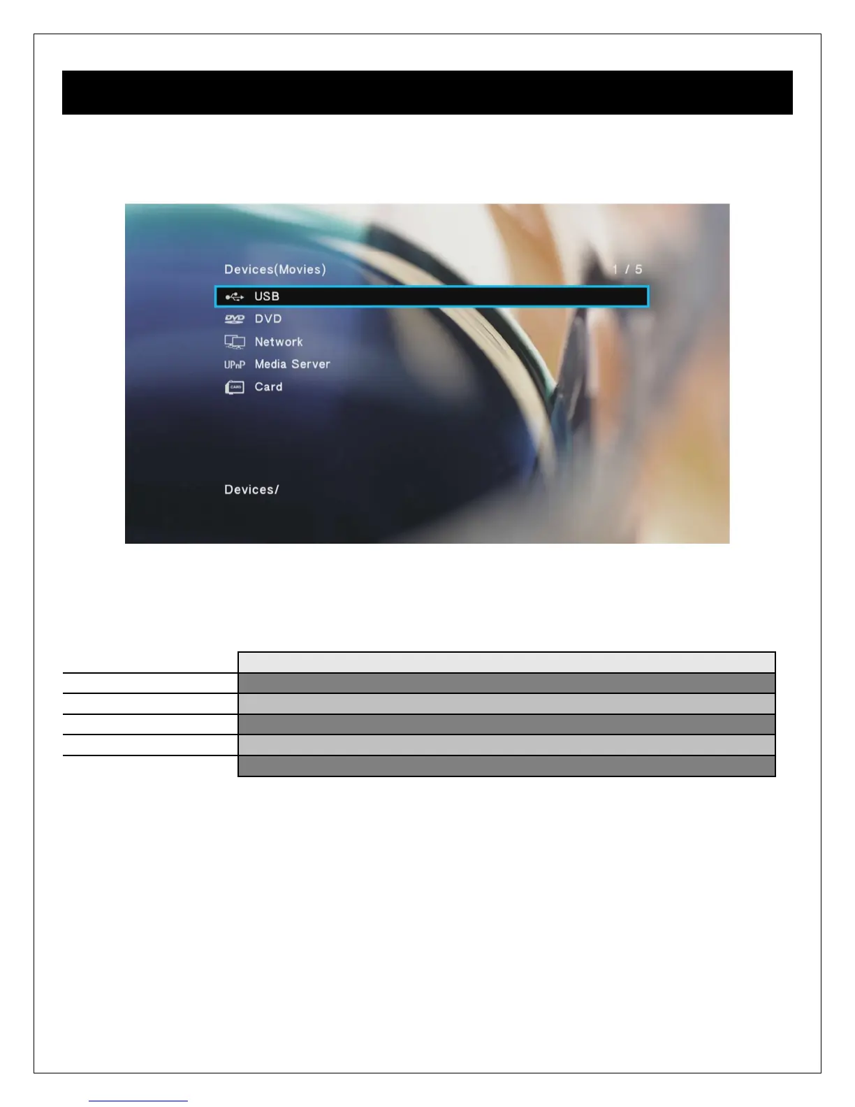 Browse media files on an external USB drive attached to the player.