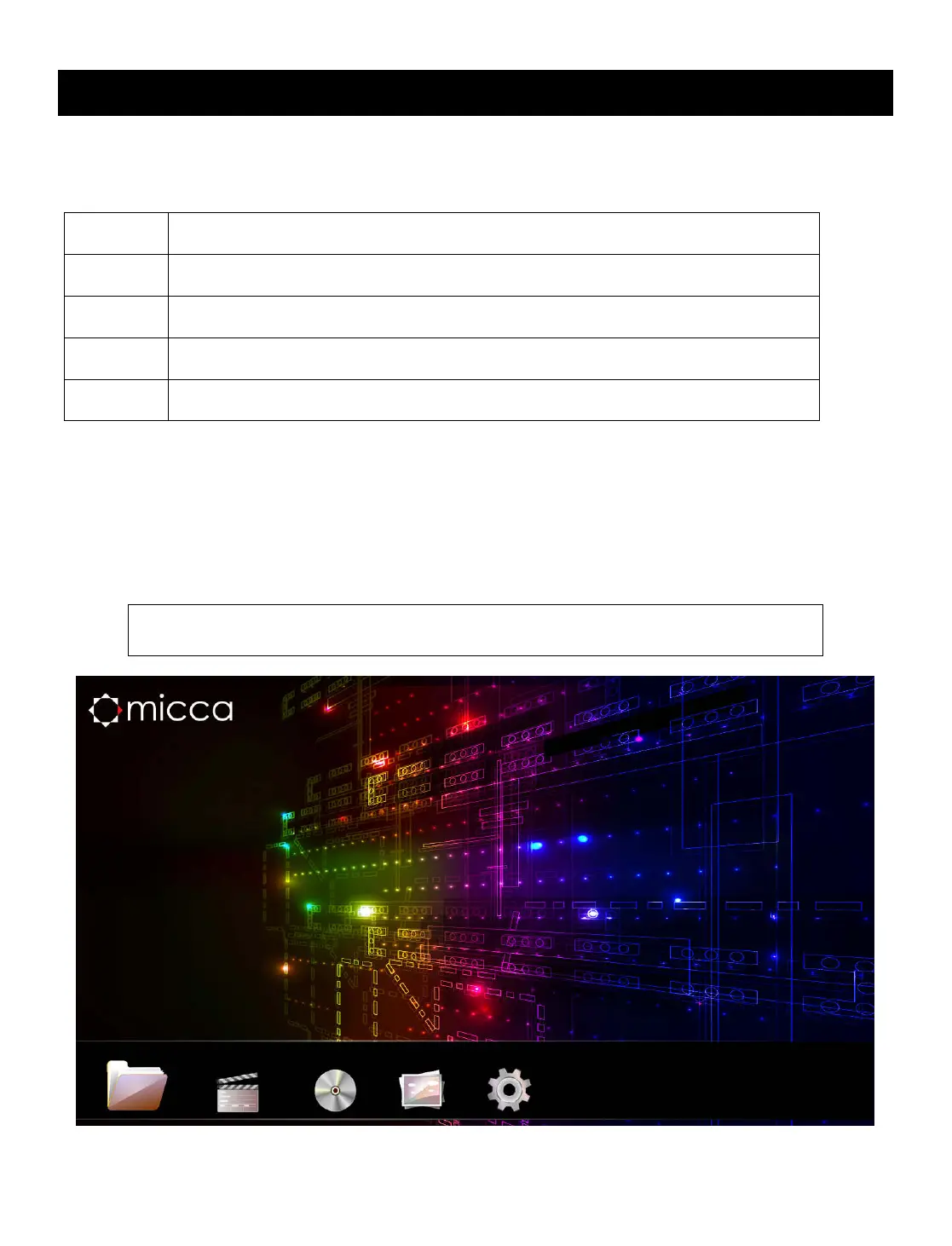 After powering on, the Micca Speck displays the Home menu screen. The Home menu