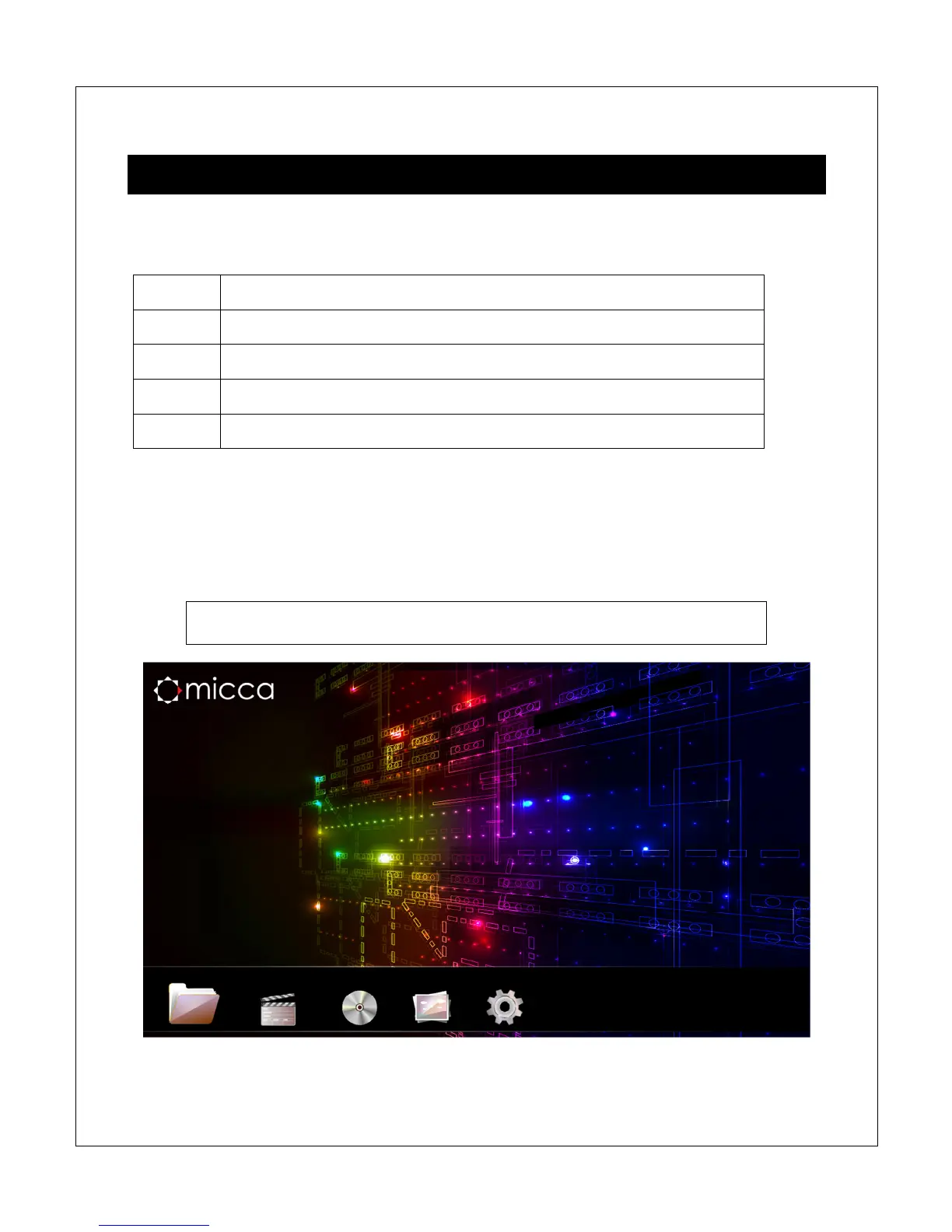 After powering on, the Micca Speck displays the Home screen. The Home screen