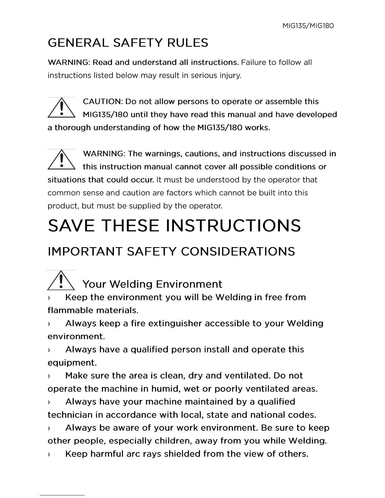 Michigan Welding MIG135 - General Safety Rules; Your Welding Environment; Important Safety Considerations