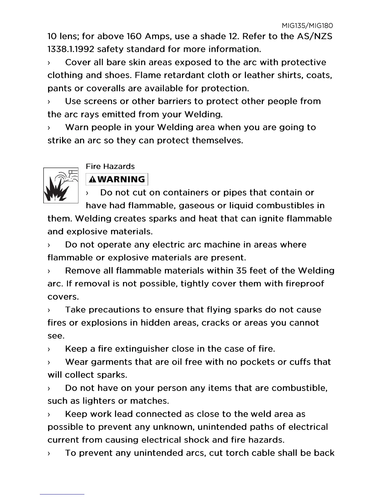 Michigan Welding MIG180 - Fire Hazards and Prevention