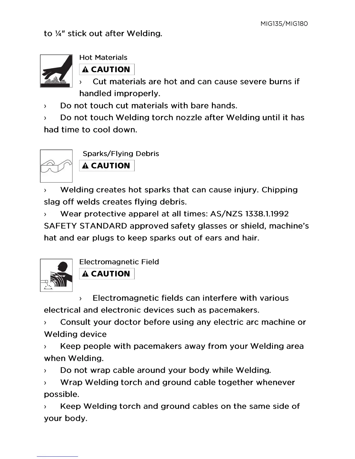 Michigan Welding MIG180 - Hot Material Safety; Sparks and Flying Debris Safety
