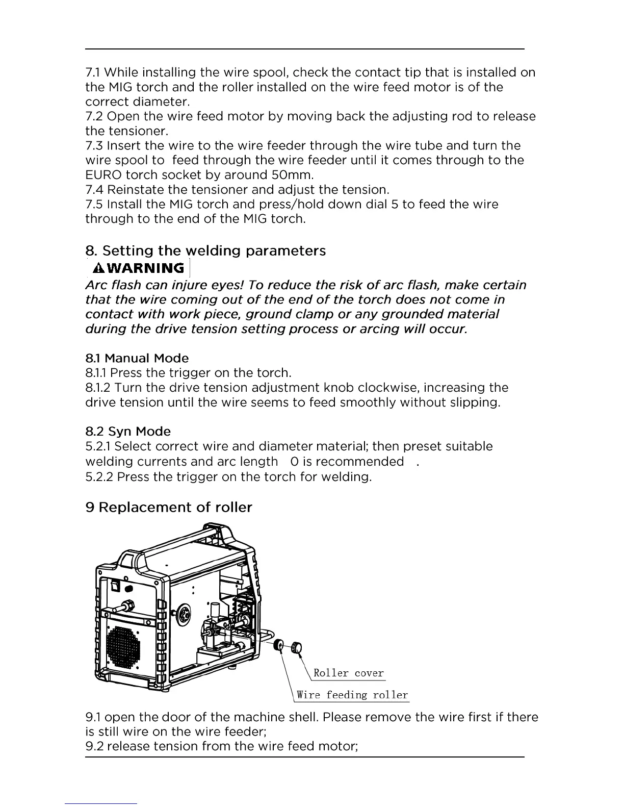 Michigan Welding MULTI200 - Setting the Welding Parameters; Replacement of Roller