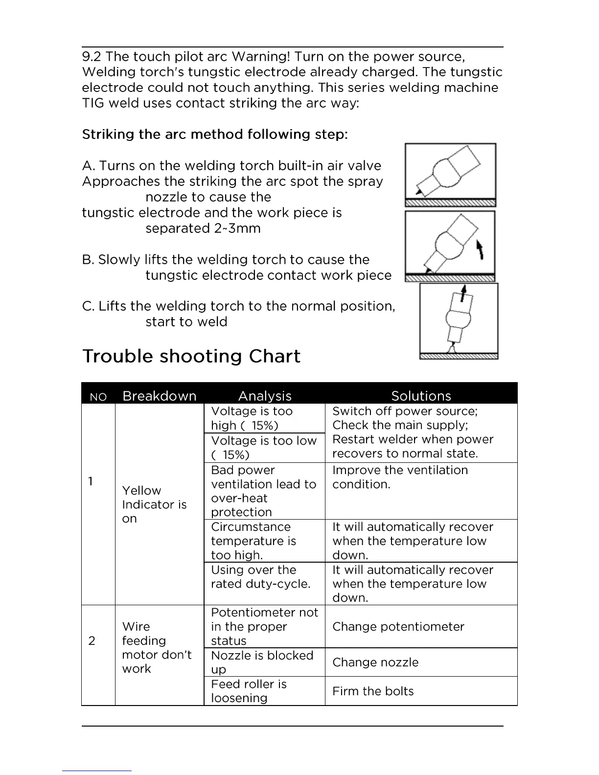 Michigan Welding MULTI200 - Trouble Shooting Chart; Striking the Arc Method Following Step