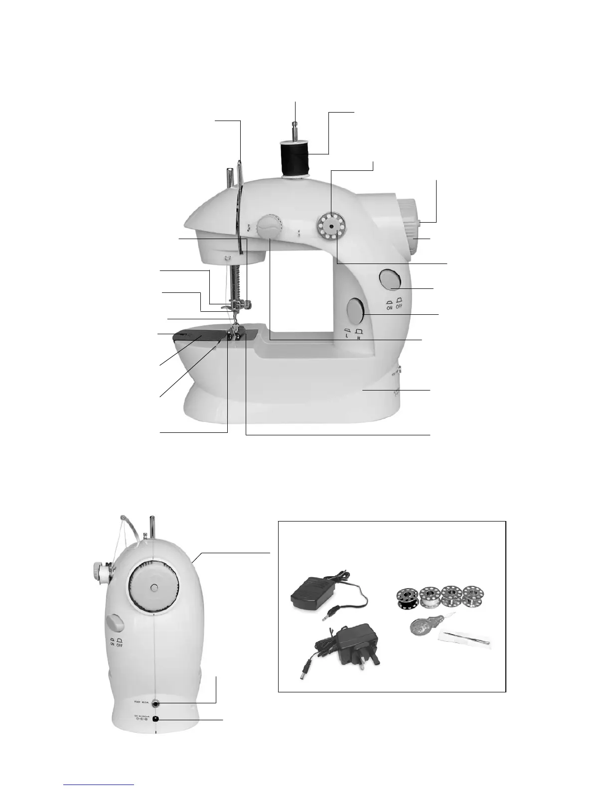 Michley MINI ELECTRIC SEWING MACHINE - Parts & Accessories; Main Unit Components; Main Unit Back View; Included Accessories
