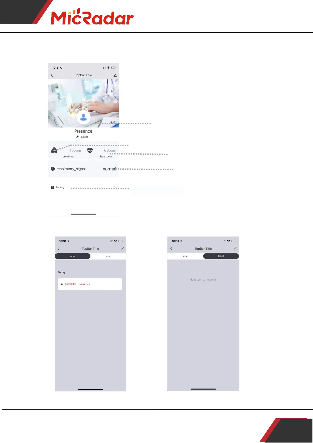 MicRadar R60ABD1 - APP Panel Interface Introduction; Real-time Environmental Status; Respiratory and Heartbeat History; Environment Status History