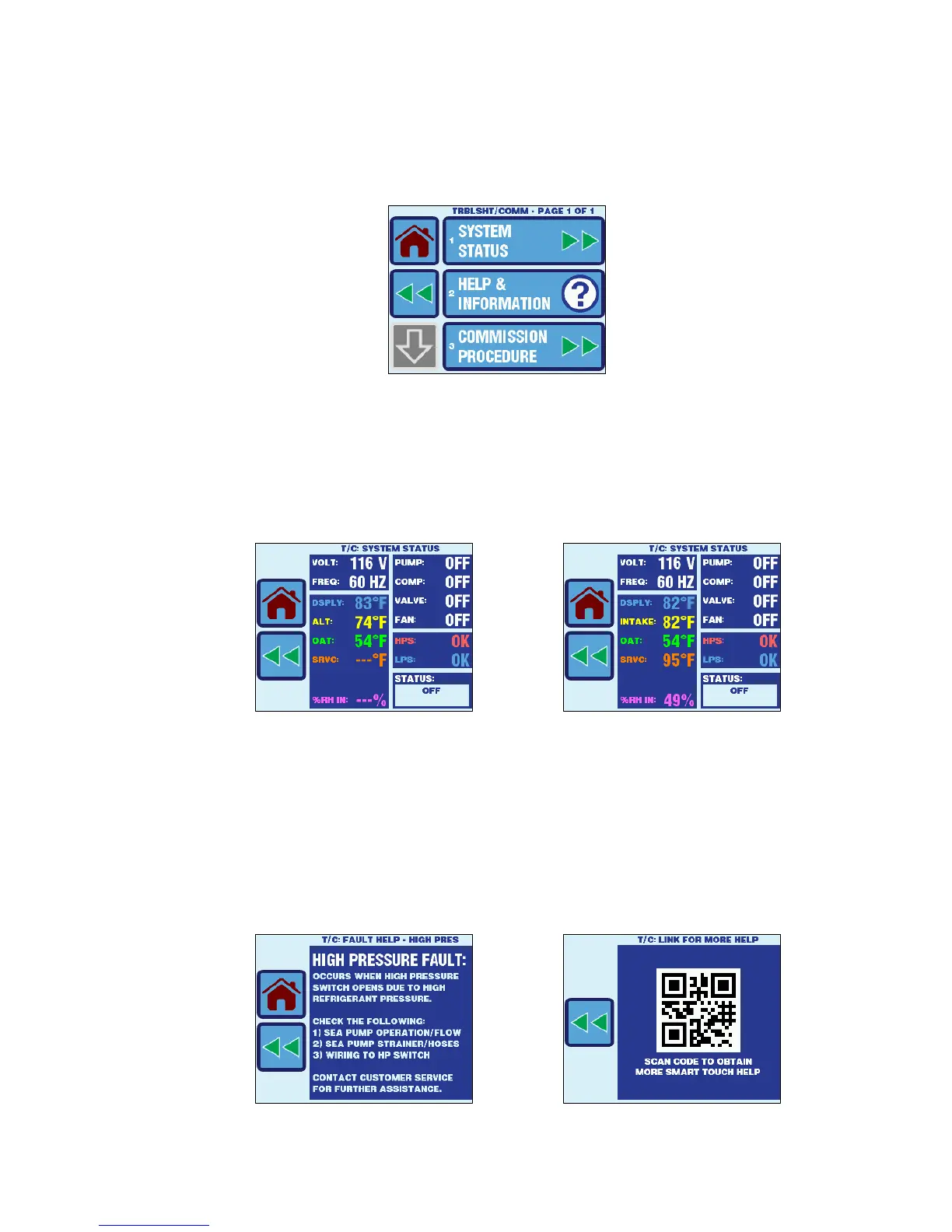 The Troubleshoot & Commission Menu allows access to the System Status, Help, and the Commission