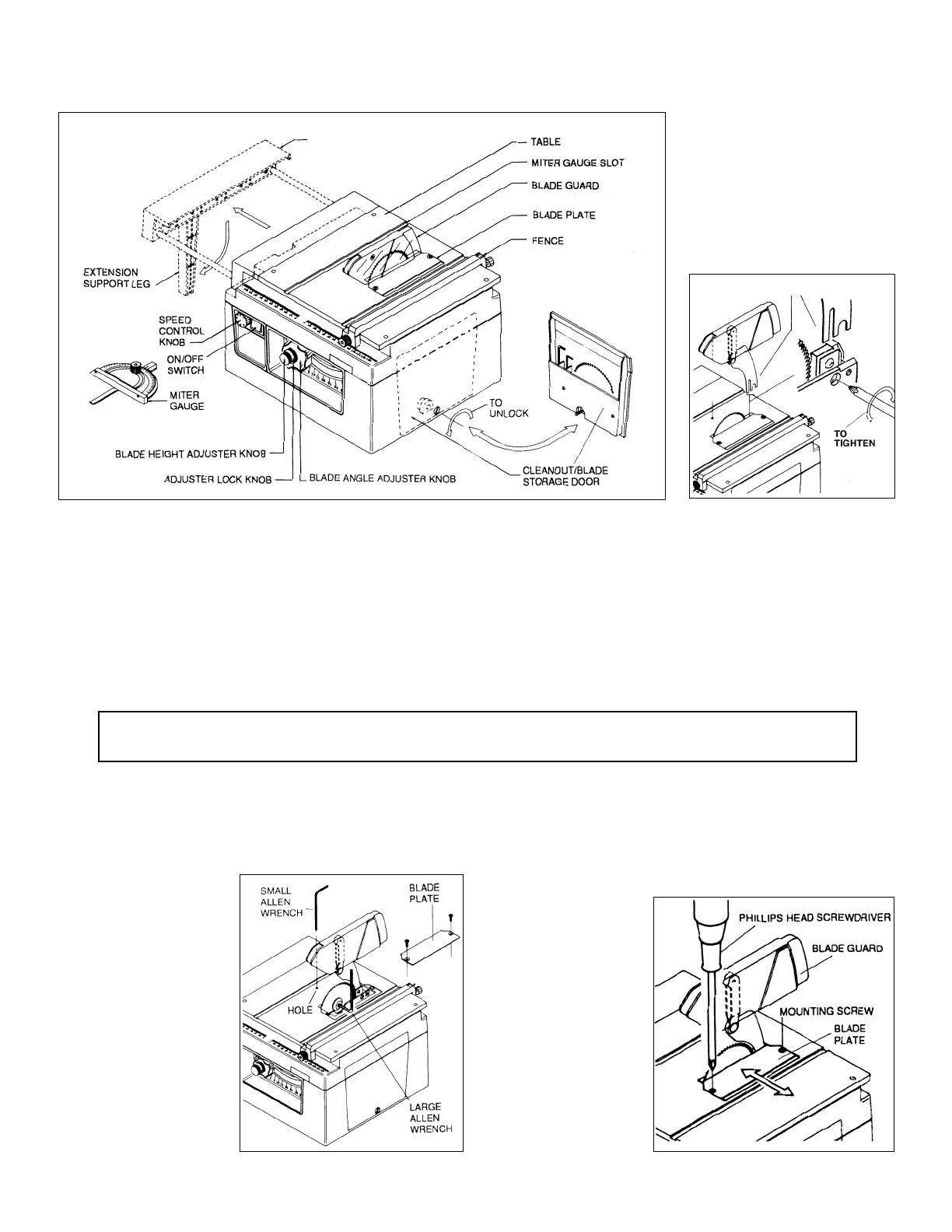 1. Remove blade plate on top of saw table by removing two