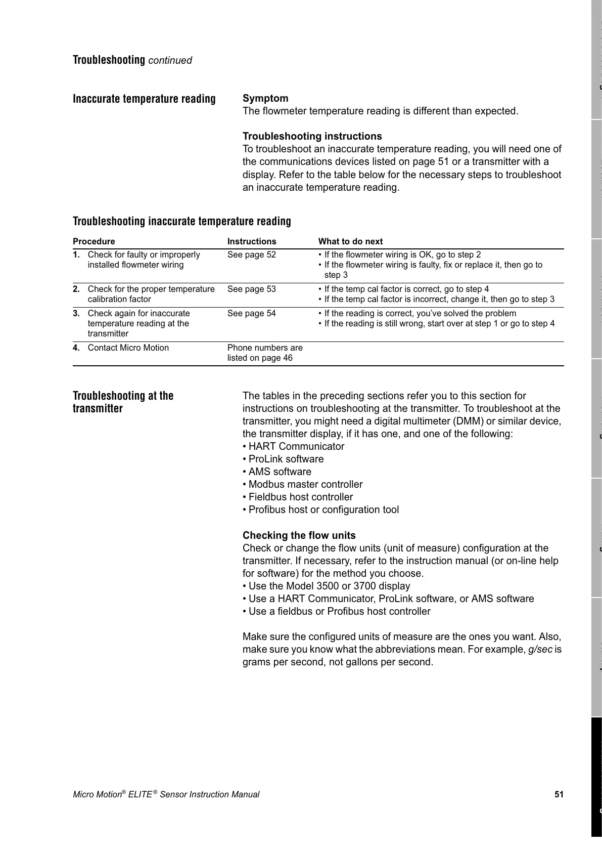 Micro Motion CMF025 - Troubleshooting Inaccurate Temperature Reading; Troubleshooting at the Transmitter; Checking and Changing Flow Units