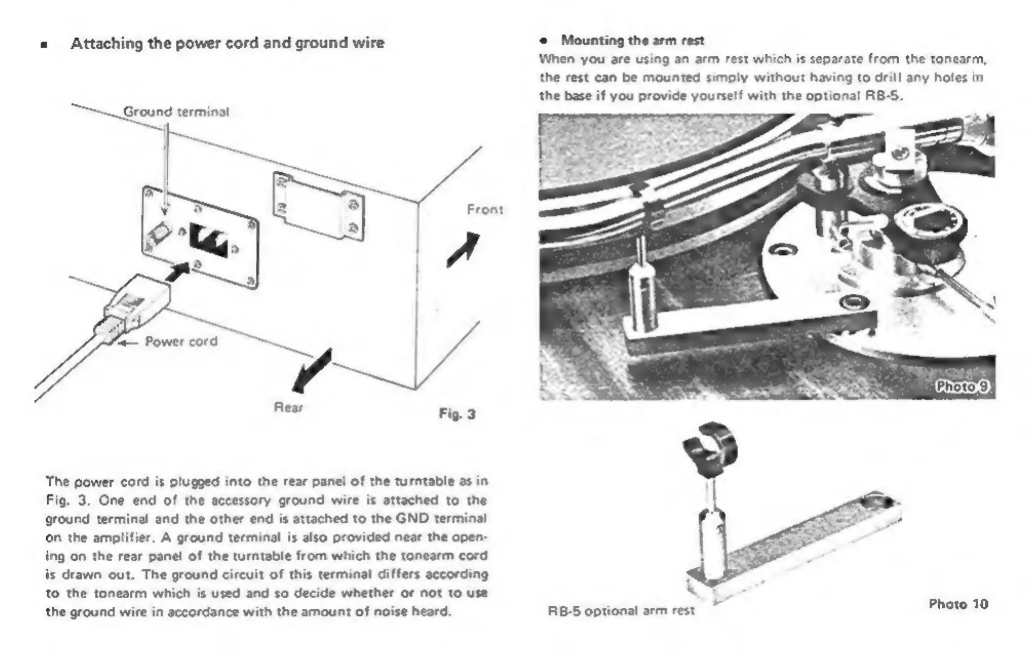 Micro Seiki BL-111 - Attaching the power cord and ground wire; Mounting the arm rest