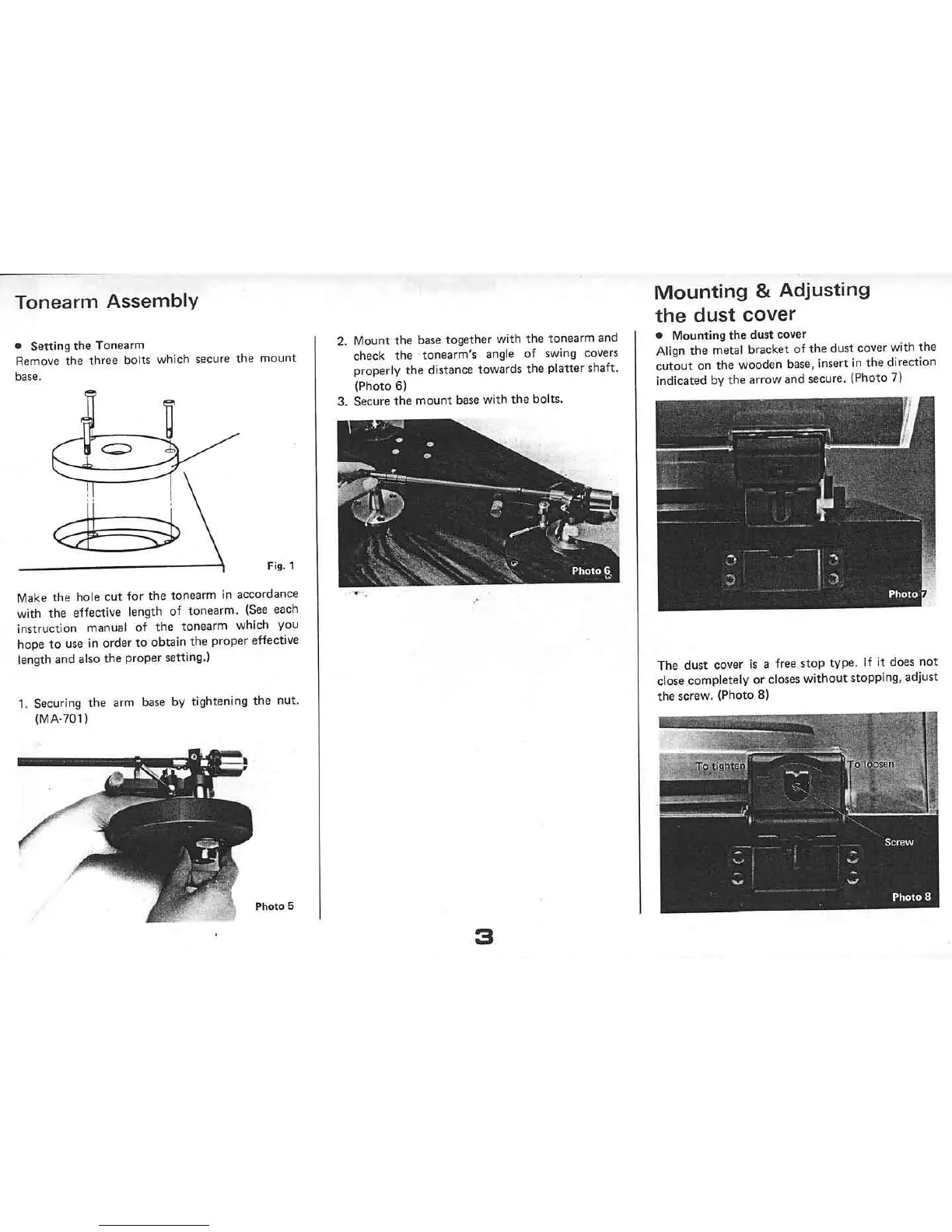 Micro Seiki BL-51 - Tonearm and Dust Cover Installation; Setting the Tonearm; Mounting and Adjusting the Dust Cover