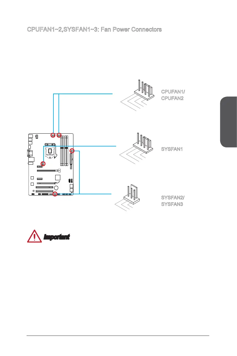 CPUFAN1~2,SYSFAN1~3: Fan Power Connectors
