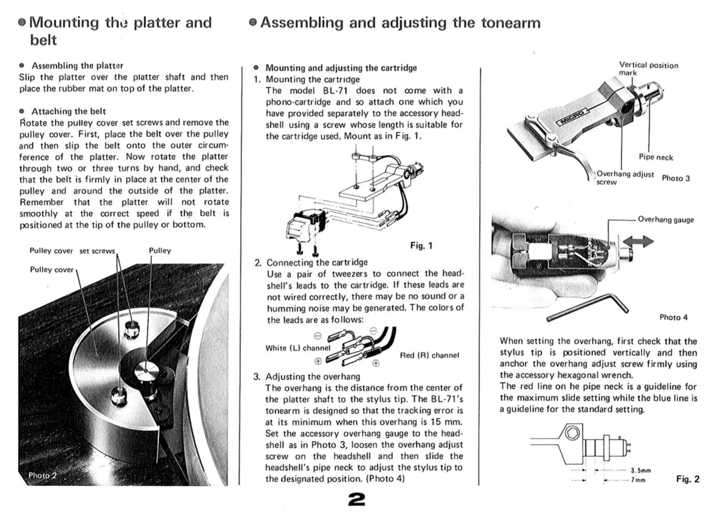 Micro BL-71 - Mounting the platter and belt; Assembling the platter; Attaching the belt; Assembling and adjusting the tonearm