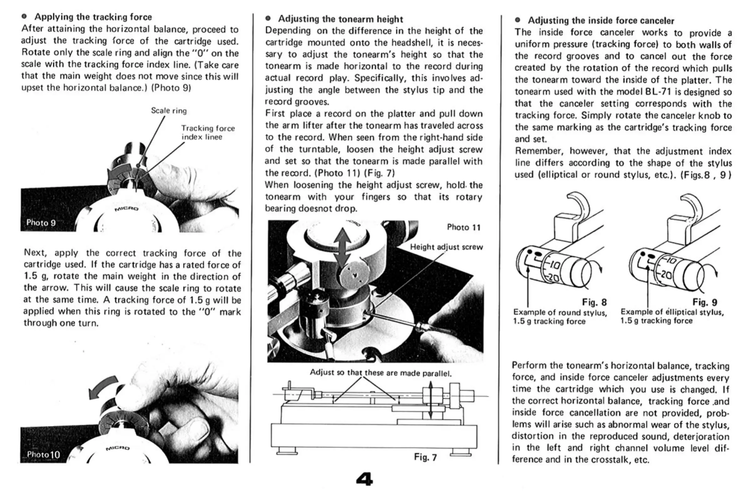 Micro BL-71 - Applying the tracking force; Rotate only the scale ring; Apply the correct tracking force; Adjusting the tonearm height