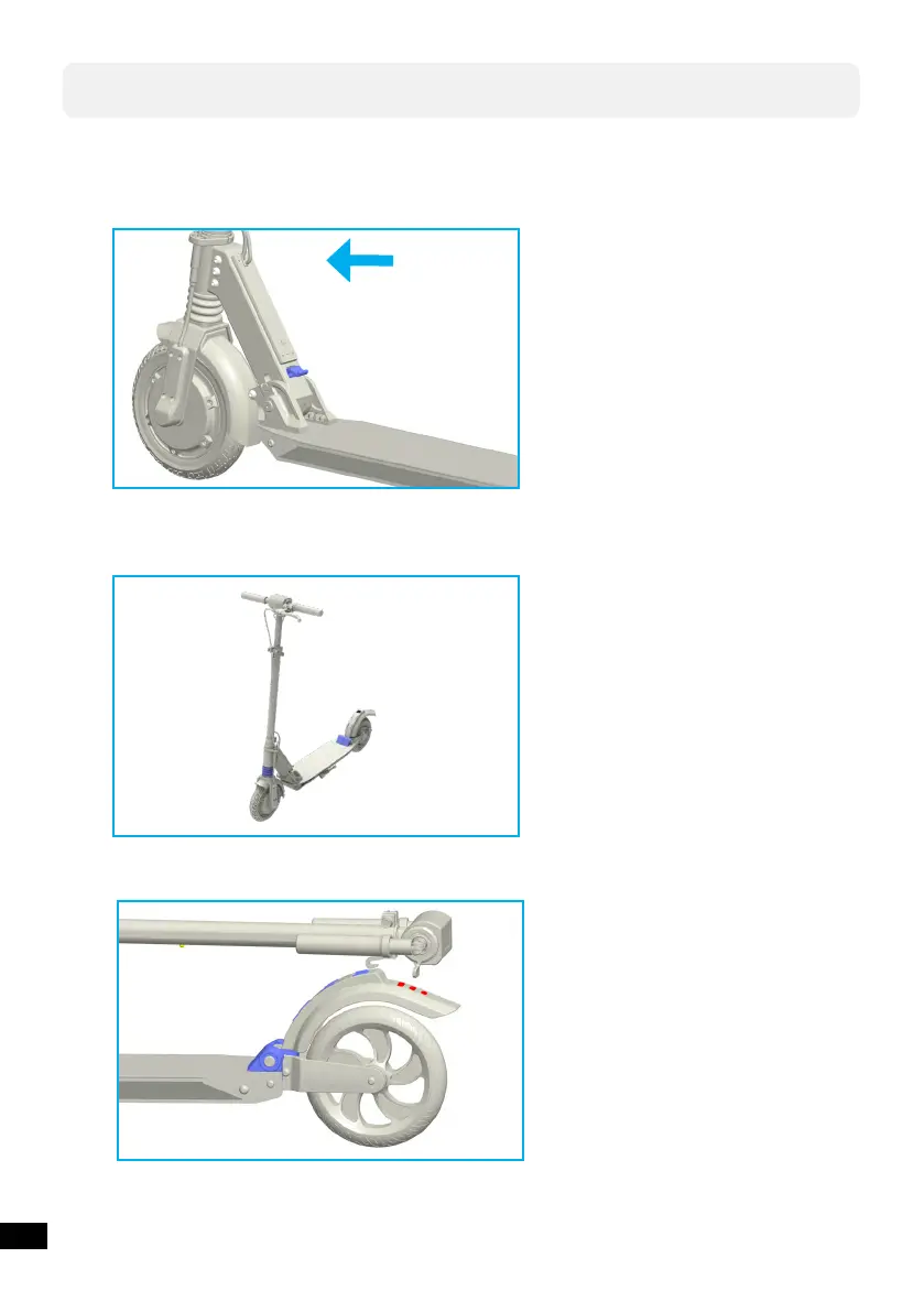 1. Om uw scooter in te klappen, duw de blauwe hendel met uw voet naar beneden