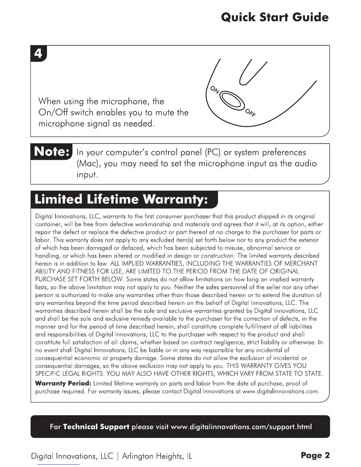 Micro MM710M - Microphone Operation; On;Off Switch Functionality; Audio Input Settings; Limited Lifetime Warranty