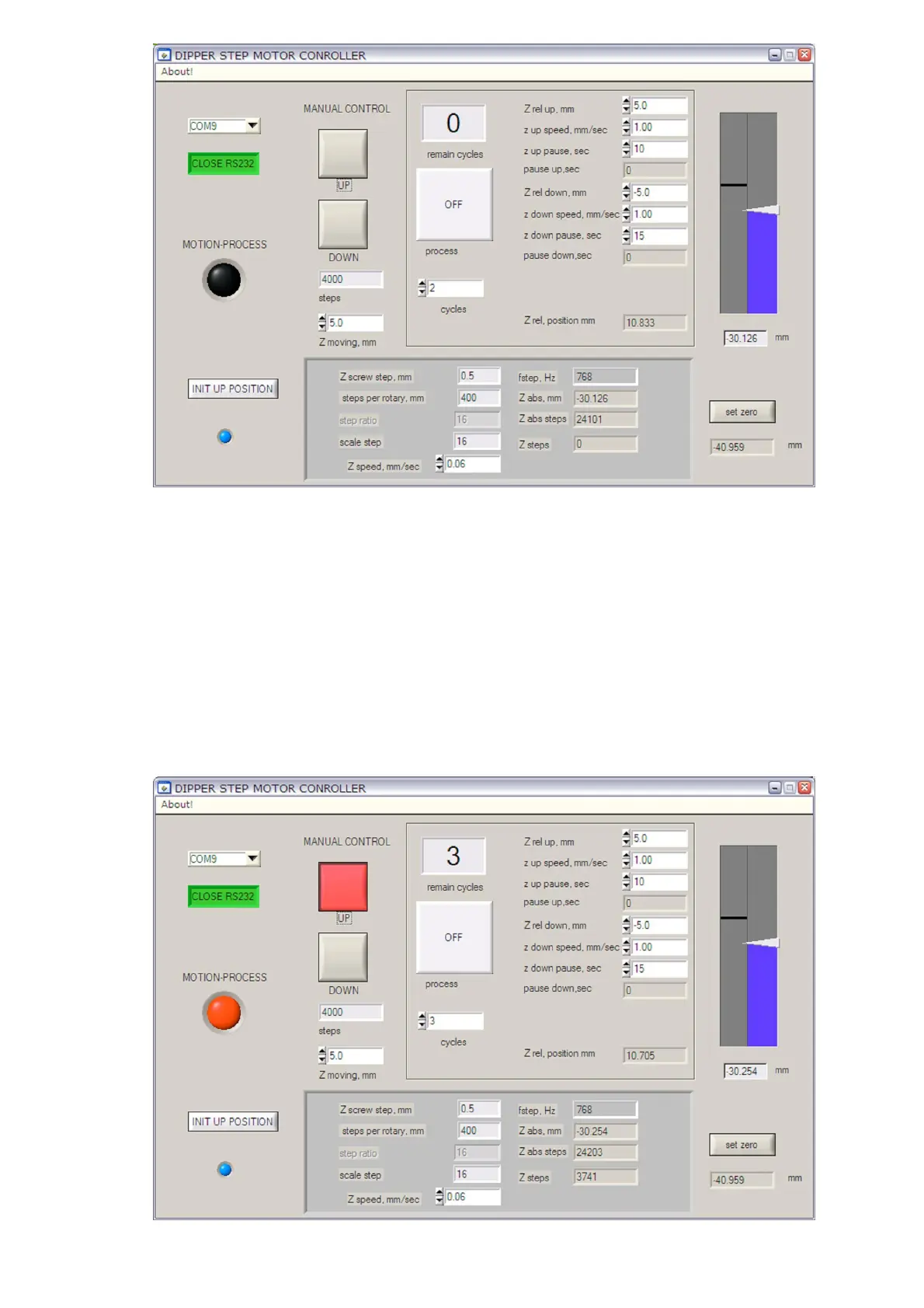button is set in pane ‘Z moving, mm’. Indicator ‘steps’ automatically shows number of steps that the stepper motor performs to