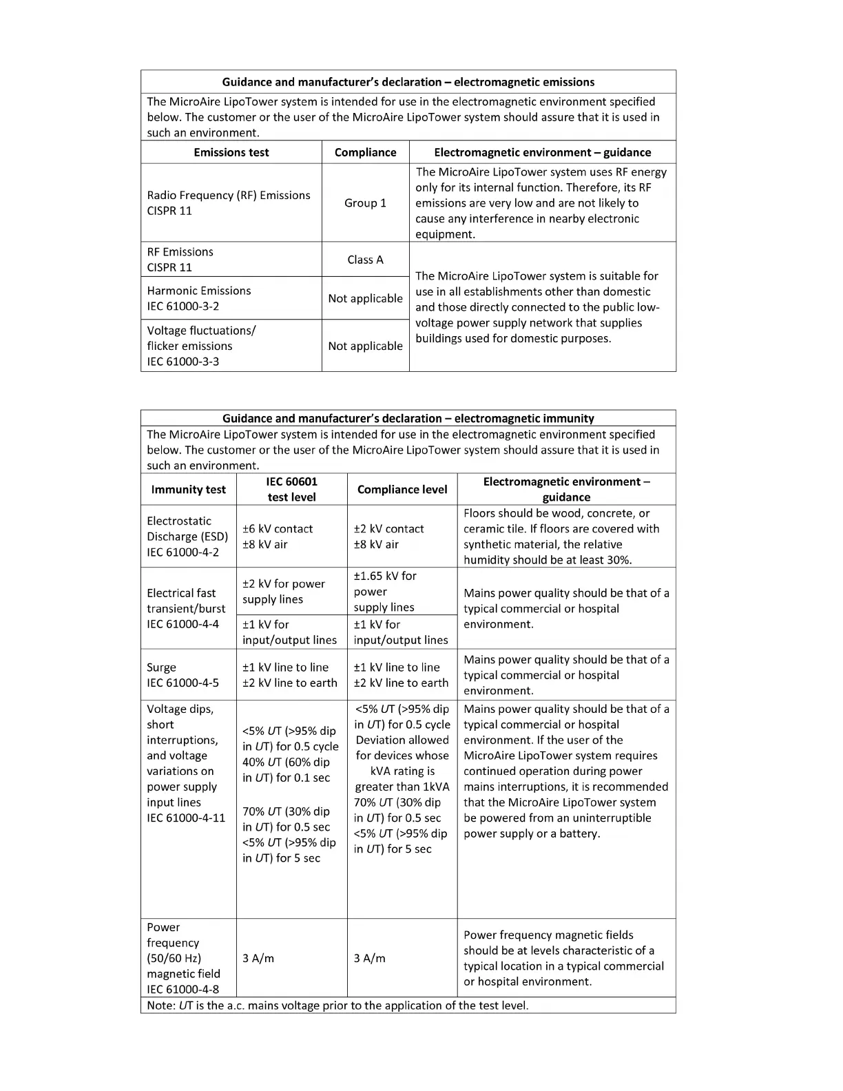 MicroAire LipoTower - Guidance and manufacturers declaration - electromagnetic emissions; Guidance and manufacturers declaration - electromagnetic immunity; Electrostatic Discharge (ESD); Electrical fast transient;burst